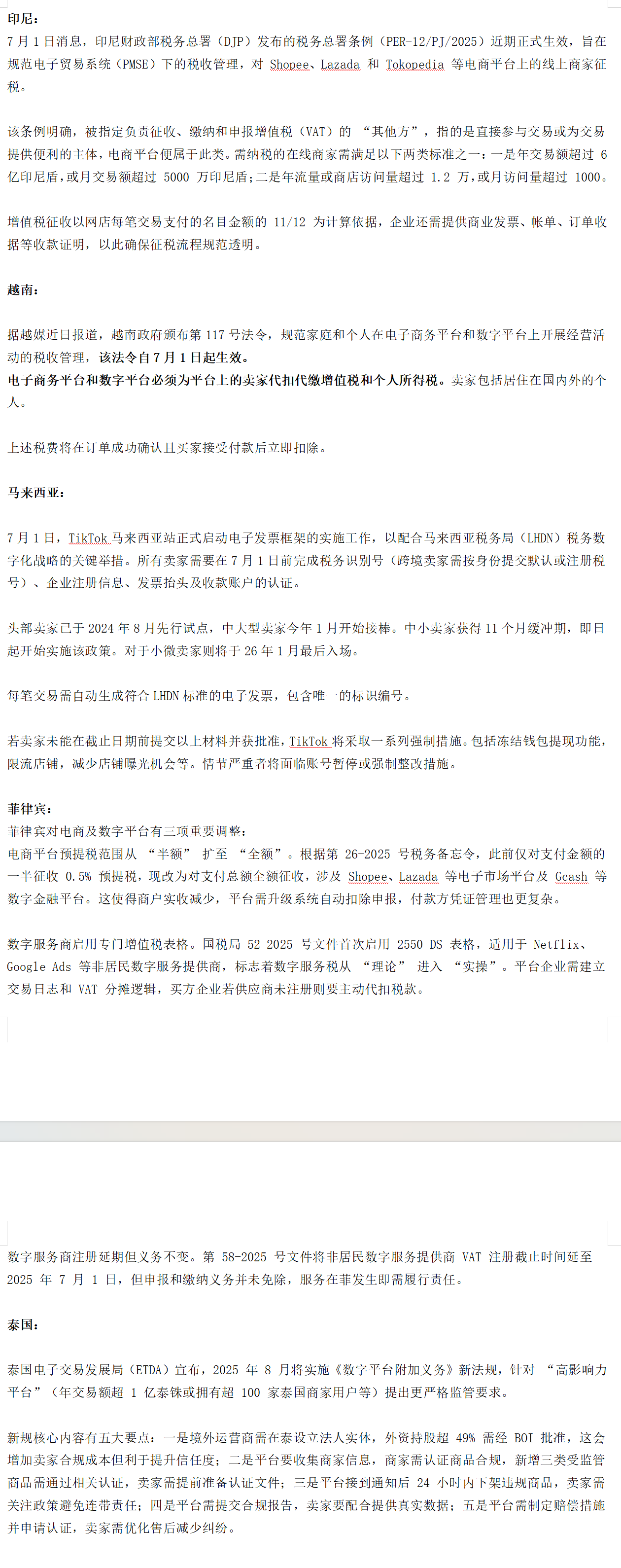 提醒游走在“灰色地带”的卖家,当前,东南亚各国已陆续推出政策,明确电商平台的责任牵头制,以规范平台上卖家的税务行为。