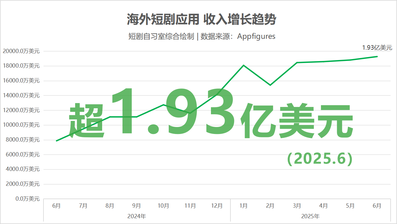 据 Appfigures 数据,2025 年 6 月,257 款海外短剧应用产生超 8459 万次下载,应用收入超 1.93 亿美元(折合人民币约 13.81 亿元),距离 2 亿大关还差临门一脚。