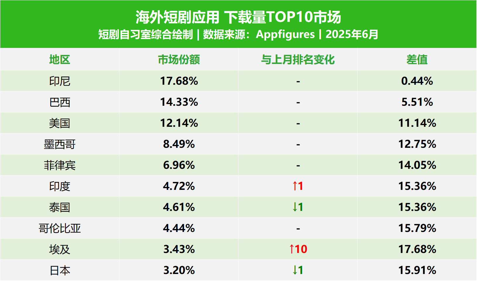 2025 年 6 月,海外短剧应用下载量 TOP10 的核心地区市场依次为印尼、巴西、美国、墨西哥、菲律宾、印度、泰国、哥伦比亚、埃及、日本。