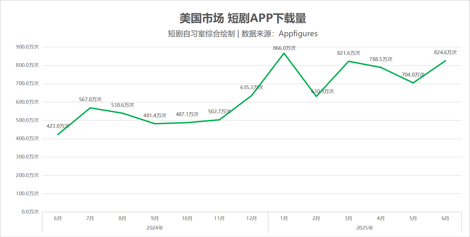 2025 年 6 月美国市场短剧 APP 下载量为 824.6 万次,与 2025 年 5 月的 704.0 万次相比,增长 17.12%。