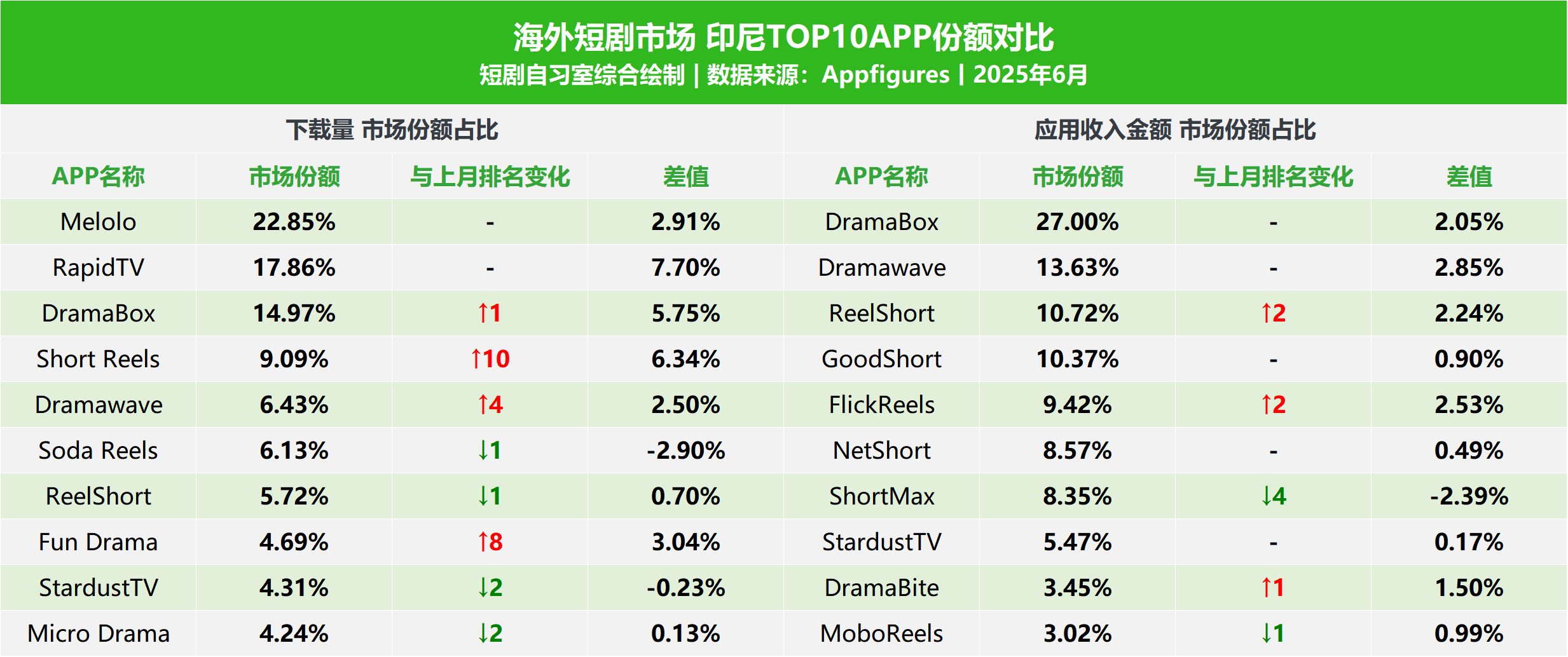 2025 年 6 月,免费应用 Melolo 在印尼短剧市场仍然占据明显优势,同为免费应用的 RapidTV 同样涨势凶猛。