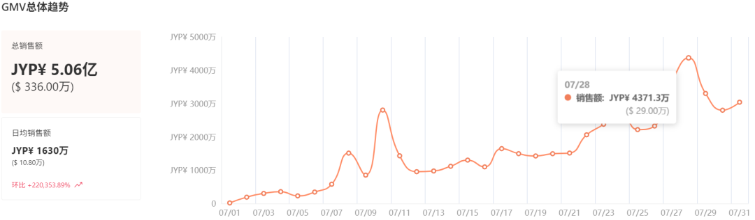 首先,从站点的总体销售情况来看,进入 7 月,TikTok Shop 日本站销售额持续攀升,增长势头十分强劲。