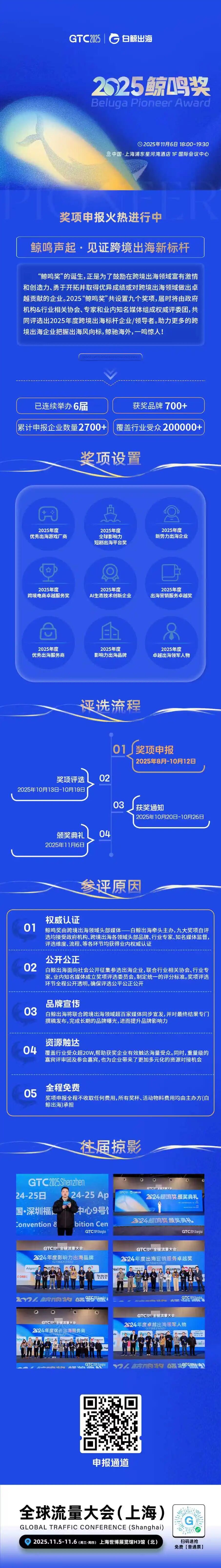 在此背景下,更需要一批引领者出现,带领中国跨境出海产业砥砺前行。基于此,2025 第七届鲸鸣奖应运而生,奖项旨在发掘和表彰在跨境出海进程中表现卓越的企业与个人,树立行业标杆,推动生态共建,为中国品牌的全球化之路注入持续动能。