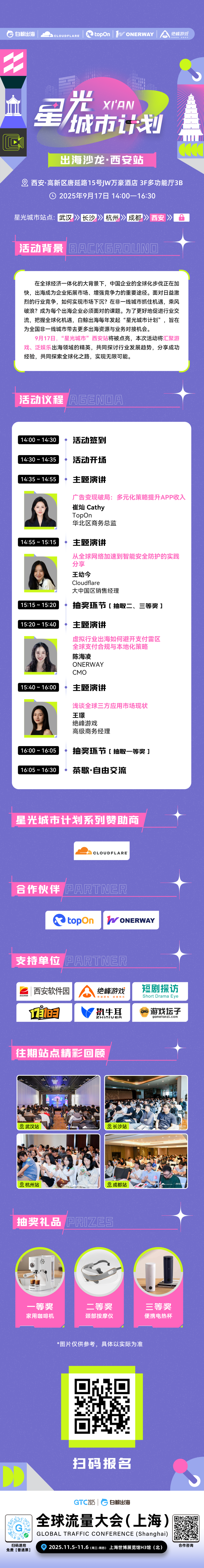 本次西安站活动,不仅延续了“星光城市”系列一贯的务实风格,更在嘉宾阵容、内容设计与环节安排上做了全面升级。我们坚信,真正的出海机会,藏在一线的实战分享中,藏在面对面的资源对接中,也藏在每一个非一线城市特有的产业土壤中。