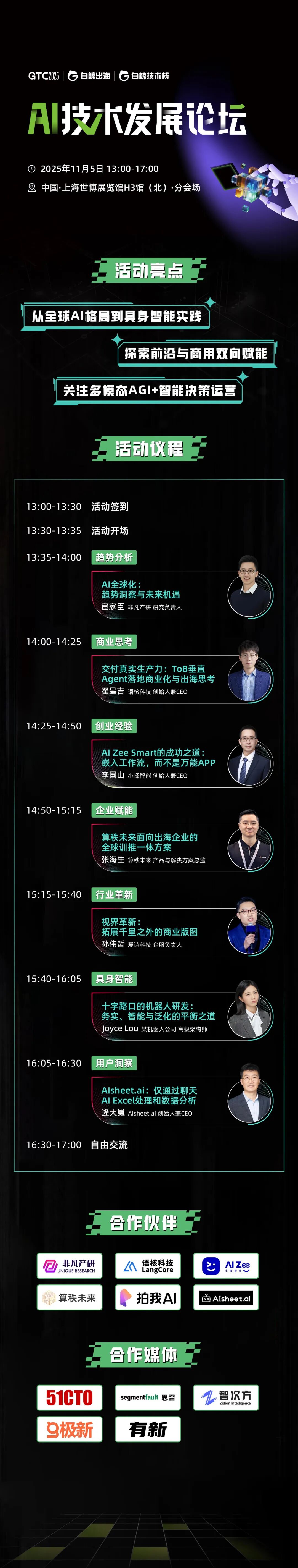 今年的GTC2025 全球流量大会(上海)如约而至,将于11月5—6日在上海世博展览馆H3馆(北)举办,为了深入探讨AI技术的最新发展趋势和商业应用,本届展会邀请到了多位行业专家和企业领袖,于GTC2025 全球流量大会(上海)分会场举办“AI技术发展论坛”,并分享他们的独到见解和成功经验。