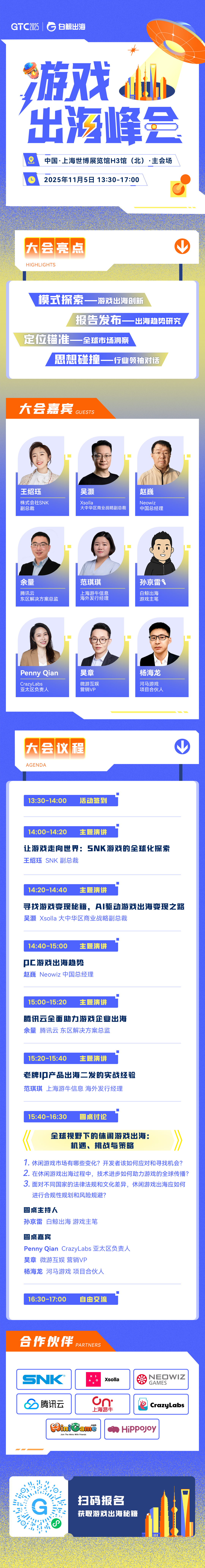 从经典 IP 的历久弥新,到 AI 技术对研发与变现的全链条重塑,再到 PC 及独立游戏领域的细分机遇,如何在新格局下构建可持续的全球化竞争力,成为整个行业的核心关切。为此,GTC2025 全球流量大会(上海)特设“游戏出海峰会”,旨在汇聚顶尖智慧,共绘下一代游戏出海的战略蓝图,峰会现已汇聚多位重量级嘉宾,带来极具深度的前瞻分享。