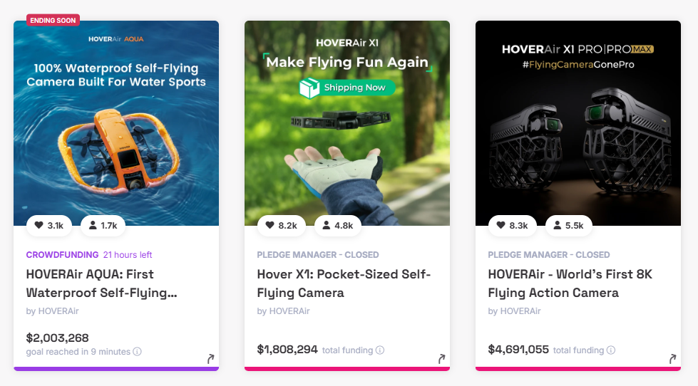 一年后,零零科技回归轻量化路线,正式推出飞行相机品牌 HOVERAir,并于 2023年首次试水美国众筹平台 Indiegogo,之后产品上新速度仿若按下了加速键。至今,HOVERAir 已推出 3 款众筹产品,几乎一年一新款,成绩均突破百万美元,其中最高者筹得近 500 万美元。