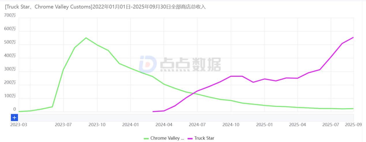 点点数据显示「Truck Star」的月流水在 2025 年 9 月创下 553 万美元的新高,成功超过此前同题材产品「Chrome Valley Customs」的 549 万美元天花板 | 数据来源:点点数据
