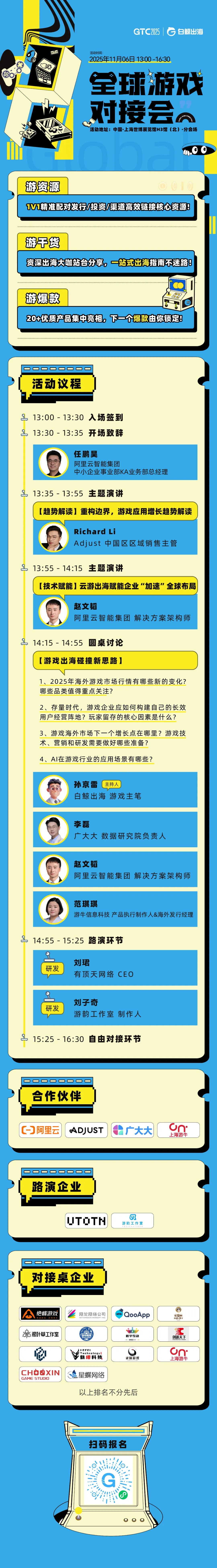思想的碰撞,旨在激发行动的火花。在嘉宾分享之后,本次活动特别设置了长达一小时的自由对接环节。对接桌阵容强大,包括有顶天网络、游韵工作室、绝峰游戏、网龙、QooApp、乐谊狸工作室、银叶草工作室、游戏曙光工作室、皓宇互动、创游天下、像素共震、鹤绯科技、灵境游戏、游牛、触炘、星蝶网络、北京奇悦互动。此外,您还将有机会与所有演讲嘉宾,以及阿里云、Adjust、QooApp、KingsGroup、上海游牛等众多顶级生态伙伴进行一对一深度交流,将收获的洞察,直接转化为可能达成的合作。