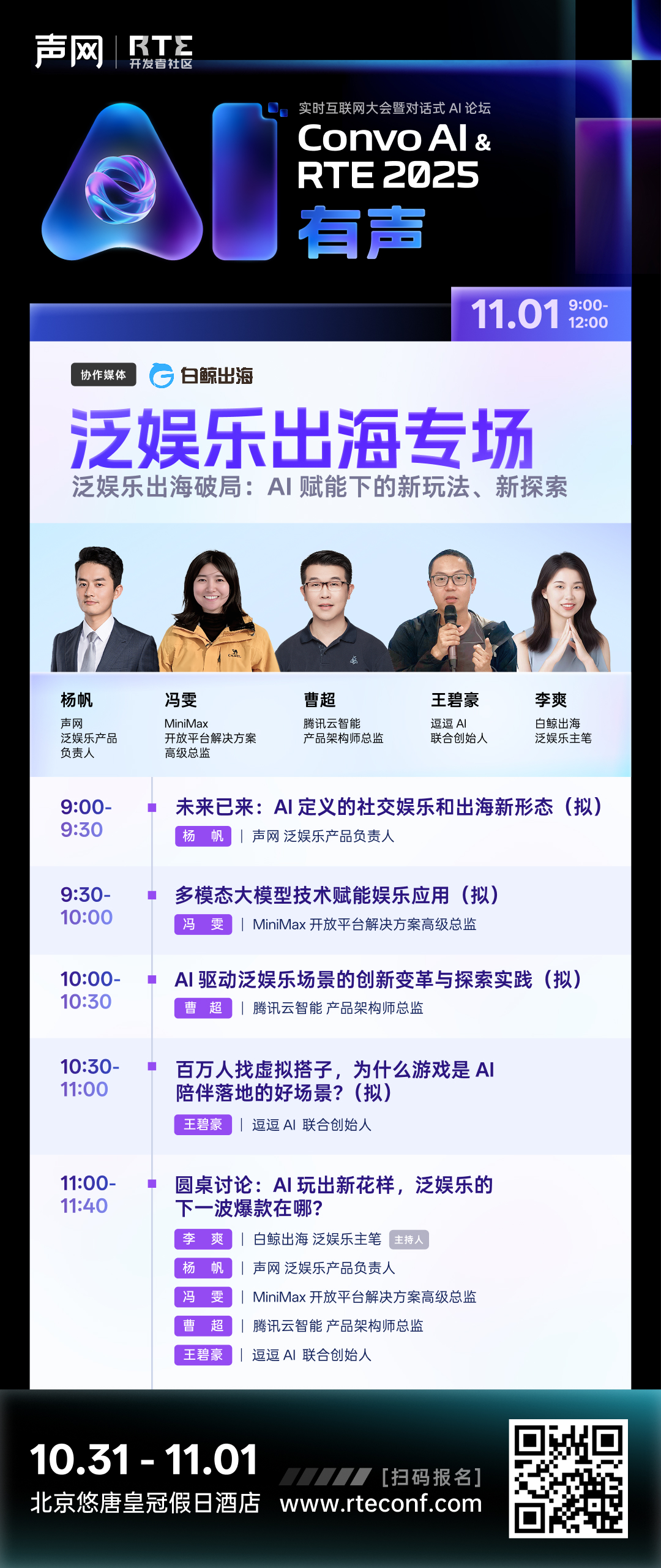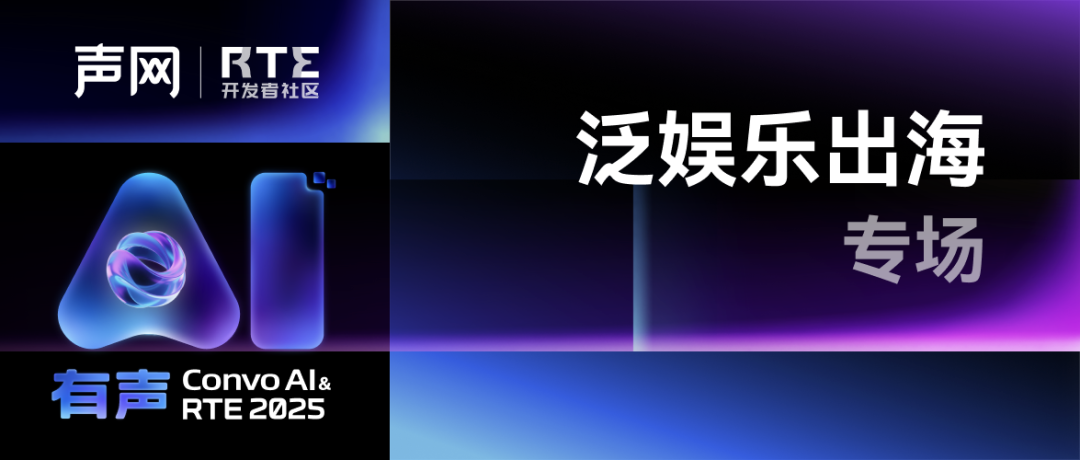 2025 年 10 月 31 日-11 月 1 日,由声网和 RTE 开发者社区联合主办的 Convo AI & RTE2025「实时互联网大会暨对话式 AI 论坛」将在北京·悠唐皇冠假日酒店正式开启!大会聚焦 AI 与 RTE 的深度融合,探索对话式 AI 在场景实践中的突破与未来。11 月 1 日上午,「泛娱乐出海专场」将以“泛娱乐出海破局:AI 赋能下的新玩法、新探索”为主题,与大家共同探讨泛娱乐出海 AI +新趋势。