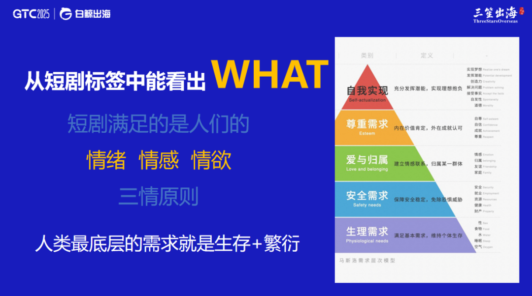 三笙出海总负责人张别人在分享中强调,“内容永远是那个‘1’,没有内容的支撑,所有资本的‘0’都将不复存在。”他结合自身从导演到内容产品经理的转型经历,指出短剧的本质是“无产阶级的艺术”,必须贴近普通用户的情感与生活,抓住“情绪、情感、情欲”三大流量密码。