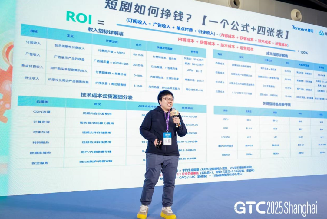 在分享伊始,郭玥用“商业逻辑—技术底座—全球通路”一条线串起整场分享,先给在座内容人一剂清醒针:国内短剧早已红海,高弃坑、长审核、单一广告分润把 ROI 压到谷底,而出海因分级制度宽松、平台抽成低,订阅、单片、NFT 周边多元变现,同样二十万成本有机会翻数倍利润。她提醒创始人别只盯着拍摄和买量,流量冲高后 IT 成本会随 DAU 线性上涨,若不在上线前把“技术降本”锁进模型,后期利润会被云账单悄悄吃光。