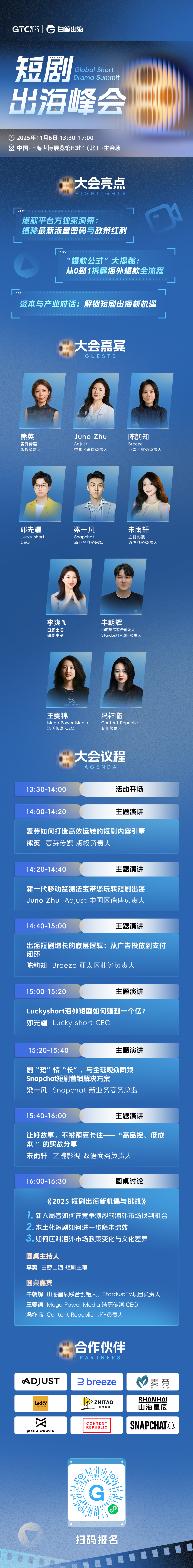 我们诚邀短剧制作人、出海营销人、平台运营者及内容创业者共同参与,一起探寻内容出海的下一站增长极。