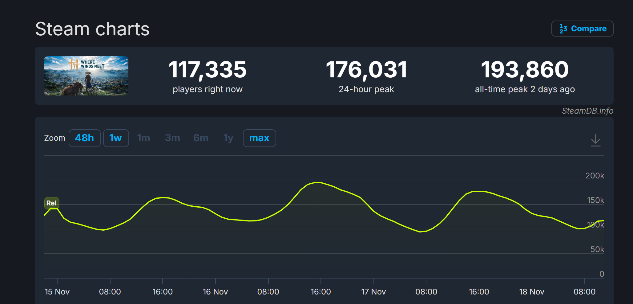 与此同时,游戏在直播平台 Twitch 上也登上游戏观看排行榜 Top2 位置,显示出全球玩家对这款武侠游戏的浓厚兴趣。这一连串数据标志着中国武侠游戏在国际市场上的一次重大突破。
