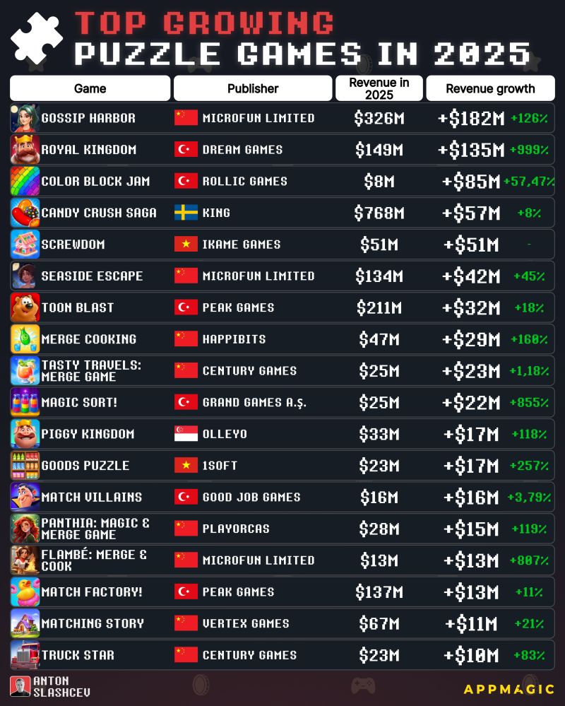 最近游戏媒体《Gamigion》根据 AppMagic 数据绘制的榜单发出了一个“喜人”的信号。这份榜单中,有至少 8 款出海休闲手游在 2025 年的流水同比增幅超过 1000 万美元,占据了整个榜单约一半的席位。但是经过我们与 AppMagic 方面求证,这份榜单的对比的是 2024 年全年 vs 2025 年前 9 个月的数据。也就是说,如果年为单位进行对比的话,2025 年的实际增幅可能会更大。
