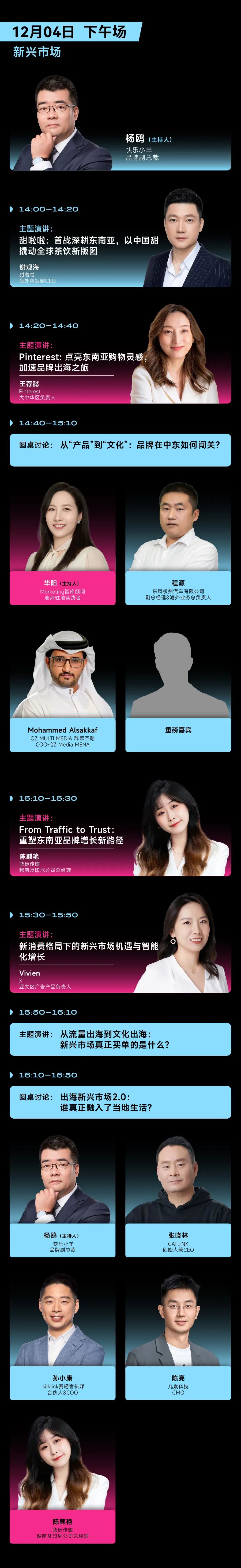 此外,Pinterest 大中华区负责人王荐懿 Erika Wang 还将现场分享《Pinterest: 点亮东南亚购物灵感,加速品牌出海之旅?》;蓝标传媒越南及印尼公司总经理陈麒艳揭秘《From Traffic to Trust:重塑东南亚品牌增长新路径》。
