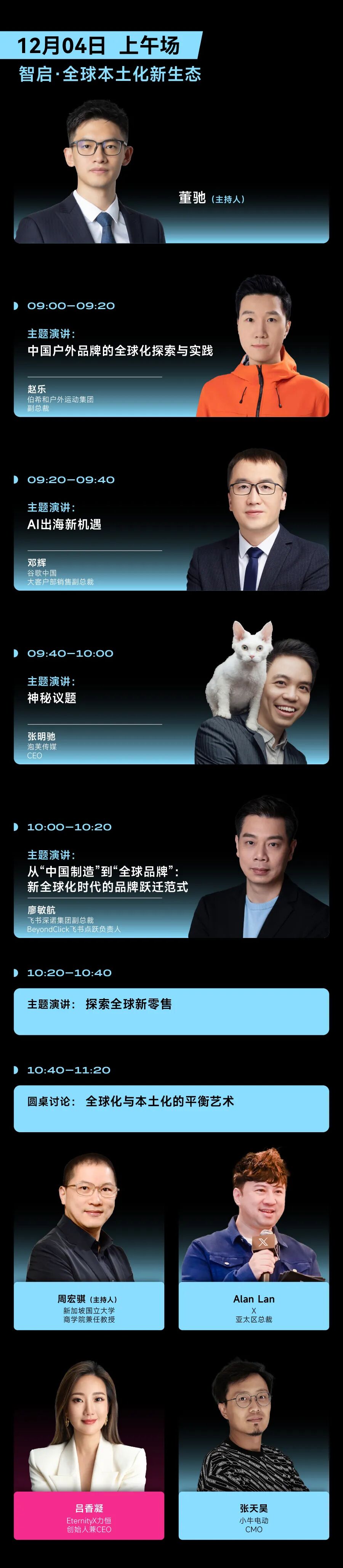 在「智启・全球本土化新生态」现场,X 亚太区总裁 Alan Lan、小牛电动 CMO 张天昊、EternityX力恒创始人兼 CEO 吕香凝,将与主持人新加坡国立大学商学院兼任教授周宏骐,以《全球化与本土化的平衡艺术》为主题展开圆桌探讨。