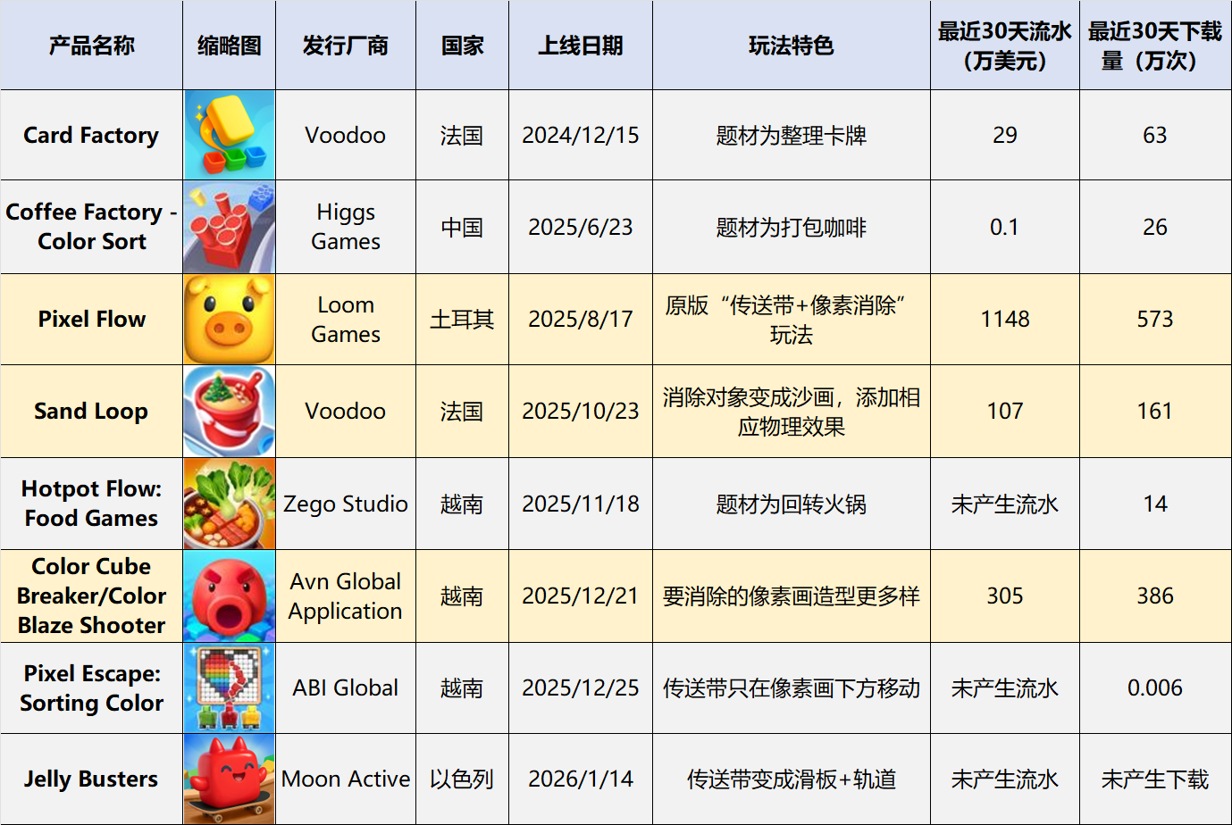 就在「Pixel Flow」上线前后的几个月时间里,市场上已经充斥了许多同类竞品。这些产品背后既有传统休闲大厂,也有近几年休闲赛道成绩亮眼的越南厂商,还不乏出海团队。