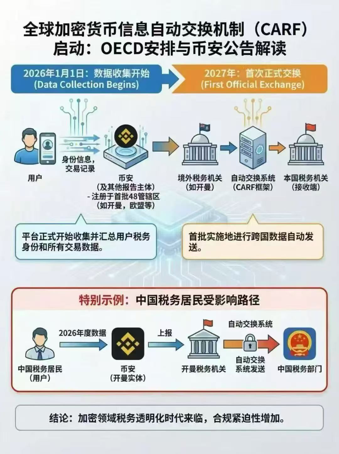 2026 年 1 月 1 日,一个对加密资产行业影响深远、但在大众层面仍被低估的国际制度正式启动:OECD 主导的《加密资产信息自动交换框架》(Crypto-Asset Reporting Framework,CARF) 开始进入数据收集阶段。根据既定时间表,2027 年将进行首次跨国自动信息交换。