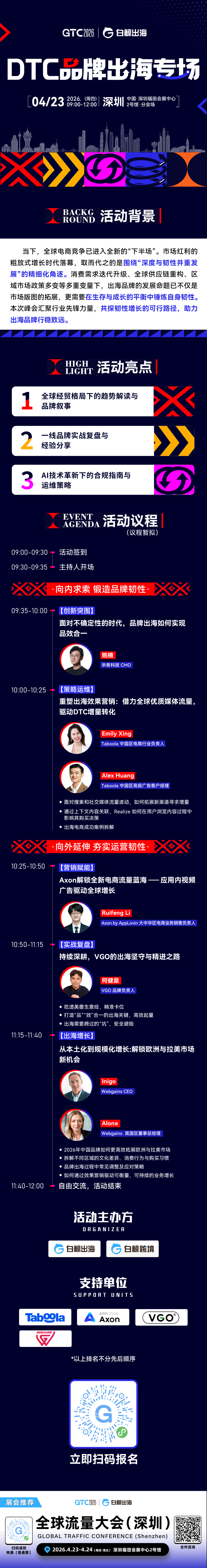 4 月 23 日上午,深圳福田会展中心 2 号馆分会场,GTC2026 全球流量大会(深圳)DTC 品牌出海专场将汇聚华青科技、Taboola、Axon by AppLovin、VGO、Webgains 等企业高管及操盘手,用整整一个上午的时间,拆解品牌出海在新周期下的生存与增长之道。