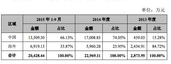 而2015 年 1-9 月、2014 年、2013 年公司前 5 大客户的销售额分别为 9468.48 万元、1.45亿元、366.91 万元,分别占当期营业收入的 46.35%、 63.48%、12.77%。