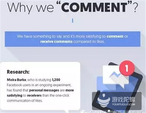 Moira Burke对1200个Facebook用户行为进行调查,发现评论能比点赞给用户带来更多的满足感。