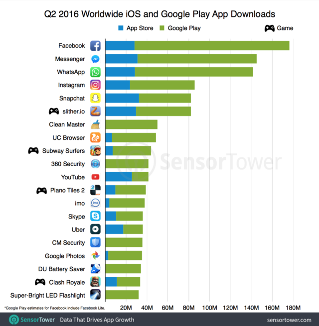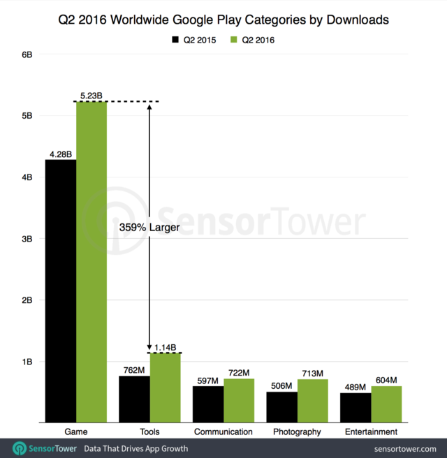 移动市场研究公司Sensor Tower近日公布了其2016年第二季度手机应用商店的下载量数据,根据数据显示第二季度,在苹果的App Store和谷歌的Google Play的应用商店中,下载量最多最受欢迎的应用程序类别依旧是游戏,下载量比去年同期增长了22%。