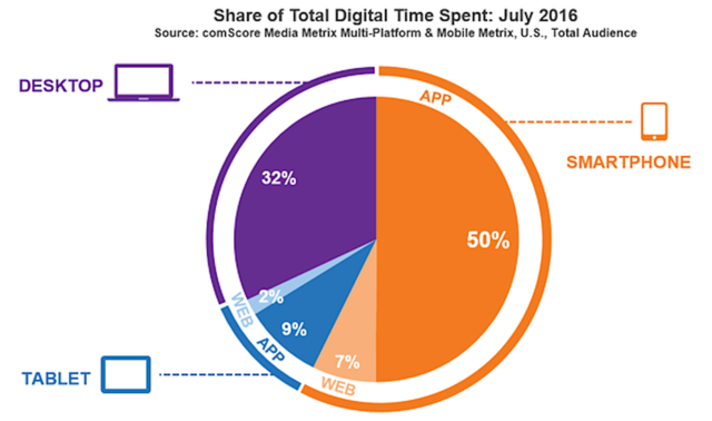 根据ComScore最新的数据,美国人超过50%的在线时间都是花在了APP上面,而在两年之前,这个比例是41%。