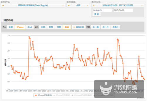在一系列举措下,我们发现CR游戏在畅销榜回暖迹象明显。2016年的9月19日、12月22日,CR因运营活动而拉高收入,分别冲回至畅销榜TOP2、TOP5的位置,目前整体保持在畅销榜前50以内。