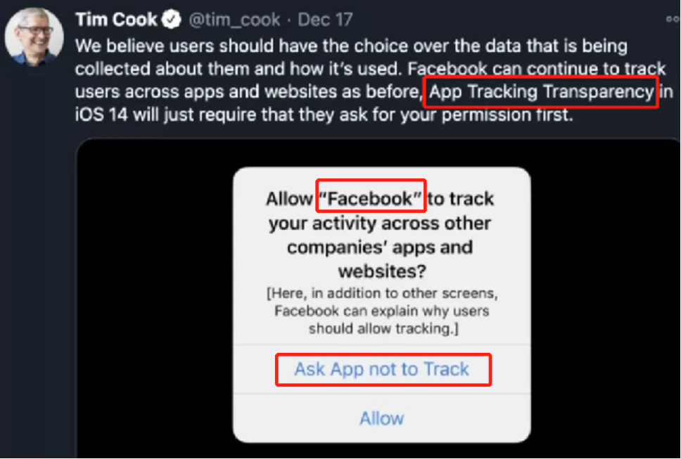 这一切的根源,在于苹果为“保护用户隐私”而推出的一项新政。该新政规定,从 iOS14 版本的系统开始,执行 ATT 隐私政策(App 跟踪透明度)。