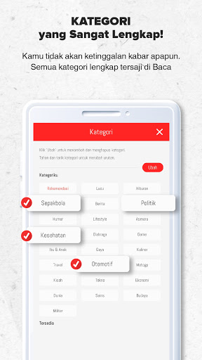 Tampilan Baca juga sangat mudah dipahami. Dengan nuansa merah yang segar, kamu bisa mengeksplor setiap artikel dengan menyenangkan. Sistem pengaturannya pun sangat bersahabat, membuat kamu bisa menyelaraskan sesuai dengan keinginan kamu.