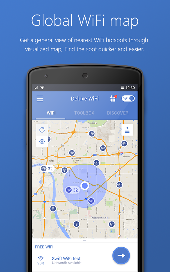 Swift WiFi Deluxe - Free WiFi Finder is a global WiFi tool which helps you locate fast, reliable WiFi networks near you, so you don’t have to eat into your data plan. Simply turn on the WiFi Finder map to see free, public hotspots nearby, and connect as quickly and as easily as you would at home.