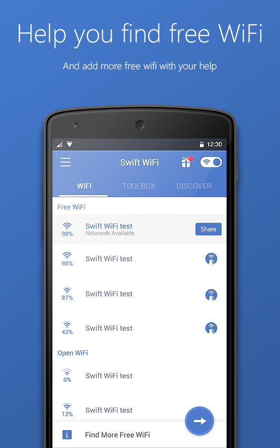 Thanks to the community of users, Swift WiFi is becoming the largest WiFi database worldwide. Swift WiFi will be your WiFi key and will automatically find all available WiFi networks nearby. You can connect to the free WiFi with one single click.