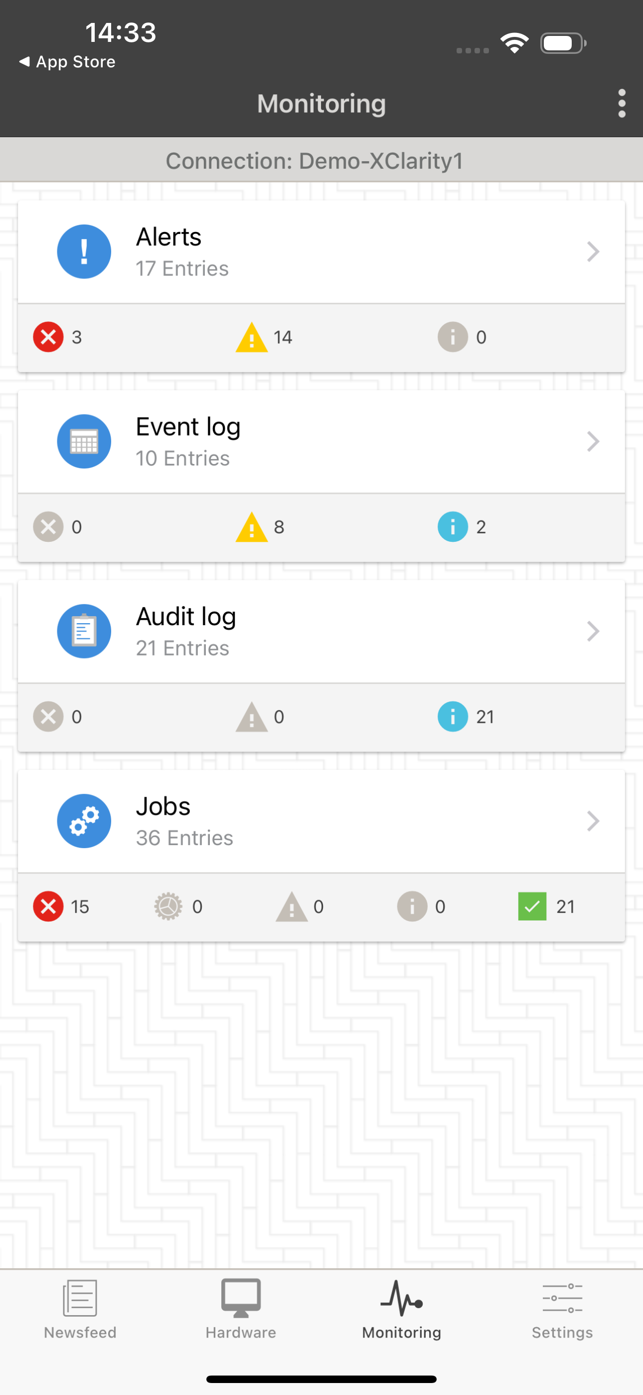 • Monitor audit events, hardware and management events, alerts, and jobs.