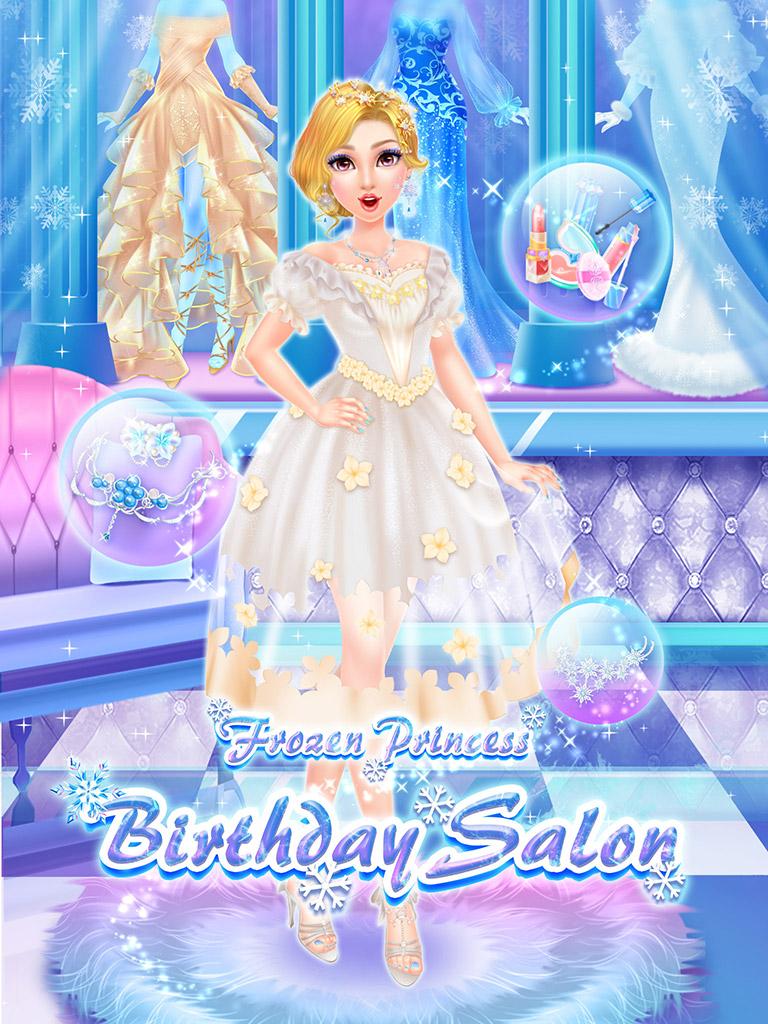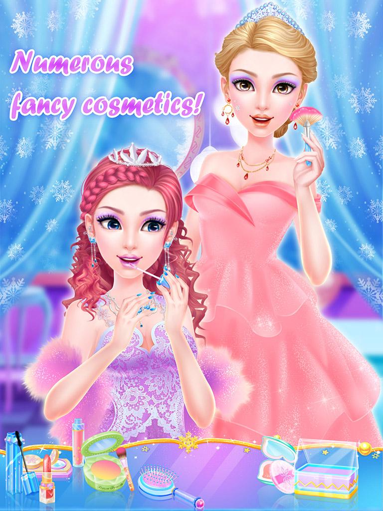 The naughty snowstorm is running everywhere and spreading snow and ice to the land. When it passes by the Castle of Frozen Ice, a glamorous face appears behind an opened window. Wow! She is the legendary Frozen Ice Princess! Why she looks worried? It turns out that she invited Prince Richard to attend her birthday banquet. Looking at the fierce wind and heavy snow outside, she feels so worried about him. Suddenly, the gate of the castle is knocked loud! Prince Richard braves the snowstorm and finally arrives! The Princess jumps with joy. Now go to the Frozen Ice Salon! She needs the most beautiful makeup and clothes to welcome the Prince!
