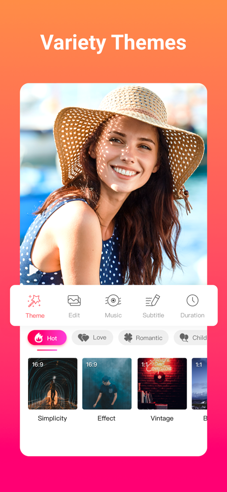 Every theme in SlidePlus slideshow video maker is carefully designed by our wonderful designers to make your video look professional. We have over 100 themes for you to choose from, featuring any occasions from weddings, baby steps, love, holidays, anniversaries, travels, pets, to business and more. We also make regular update or special edition themes to meet the individual needs of video making. There are always new ones to try on SlidePlus video editor!