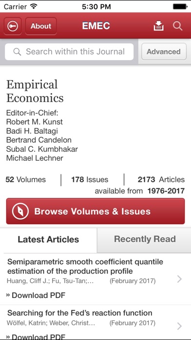 Tap into the most recent research in empirical economics with the Empirical Economics app. Empirical Economics is a peer-reviewed journal published by Springer. The Journal addresses the gap between economic theory and observed data derived from econometric methods. The Journal continuously publishes review articles, original papers and educational articles written by leading members of the economics community.
