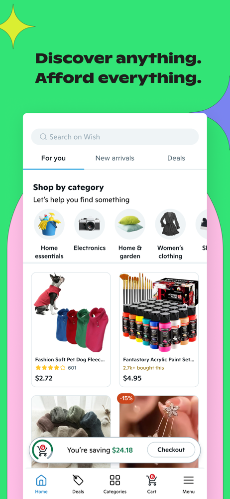 Wish is home to deals on millions of items from around the world. The destination for home and life - discover everything from everyday basics, hobbies & DIY, fashion for all, the latest in tech, to the wonderfully unexpected - and everything in-between, at prices likely to make you smile! The Wish app is the internet’s best-kept secret for affordable online shopping.