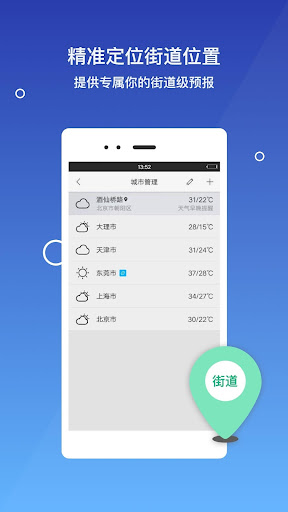 【定位街道、精准预报】精确预报你所在街道的天气,城市那么大,相比整个城市的天气预报,你更关心的是你所在位置的天气。