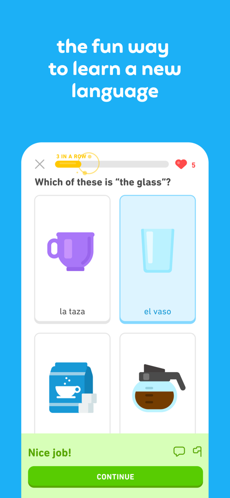Learn a new language with the world’s most-downloaded education app! Duolingo is the fun, free app for learning 40+ languages through quick, bite-sized lessons. Practice speaking, reading, listening, and writing to build your vocabulary and grammar skills.