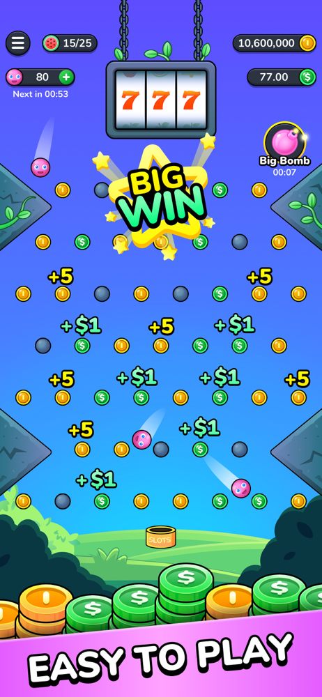 Drop down a small ball, and you may get a big prize! The more you play, the more rewards you will win! What are you waiting for? Download now and enjoy Plinko master!