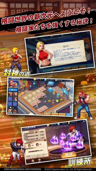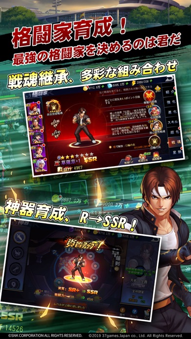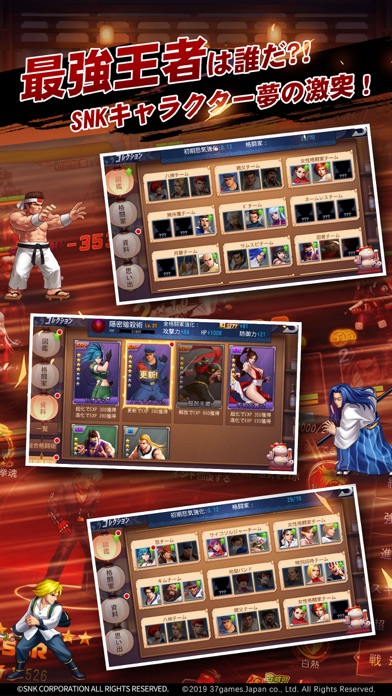 SNKオールスターは『THE KING OF FIGHTERS '98 ULTIMATE MATCH』、『THE KING OF FIGHTERS 2002 UNLIMITED MATCH』、『サムライスピリッツ 天草降臨』、『幕末浪漫 月華の剣士』等の作品を基に、SNKの人気キャラクターをカード連撃、能力継承、次元探索等の遊び方を取り入れた格闘RPGスマホゲームです。懐かしいストーリーを一風変わった戦闘システムで楽しめます。