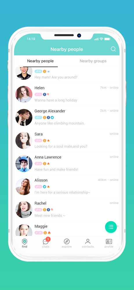 Say Hi can help you find new people nearby! It helps you find love by chat, meet and date new friends!